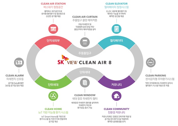 SK건설은 25일 아파트 공기질 개선 토탈 패키지인 ‘SK뷰 클린에어 8(SK VIEW Clean Air 8)’을 개발, SK뷰 단지에 단계적으로 적용할 방침이라고 밝혔다.