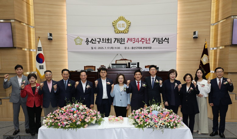 [용산구 세계타임즈=이장성 기자] 서울 용산구의회(의장 김성철)는 7월 17일 본회의장에서 ‘용산구의회 개원 34주년 기념식’을 열고 의정 성과를 돌아보며 향후 비전을 공유했다. 제299회 임시회 폐회 직후 열린 이날 행사에는 김성철 의장을 비롯한 의원들과 박희영 용산구청장, 집행부 공무원, 지역 언론인 등이 참석했다.