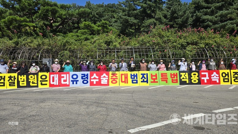 공익감시 민권회의(의장 송운학), 국민연대(상임대표 이근철), 기업윤리경영을 위한 시민단체협의회(공동의장 이보영) 등 시민사회단체가 4일 오전 11시 서울중앙지방법원 앞에서 불법 대리·유령수술 규탄 기자회견을 열고 법원과 검찰을 향해 보건범죄 단속에 관한 특별조치법(보특법)을 적용, 면허 취고, 자격정지 등 강력한 처벌을 요구하고 있다.