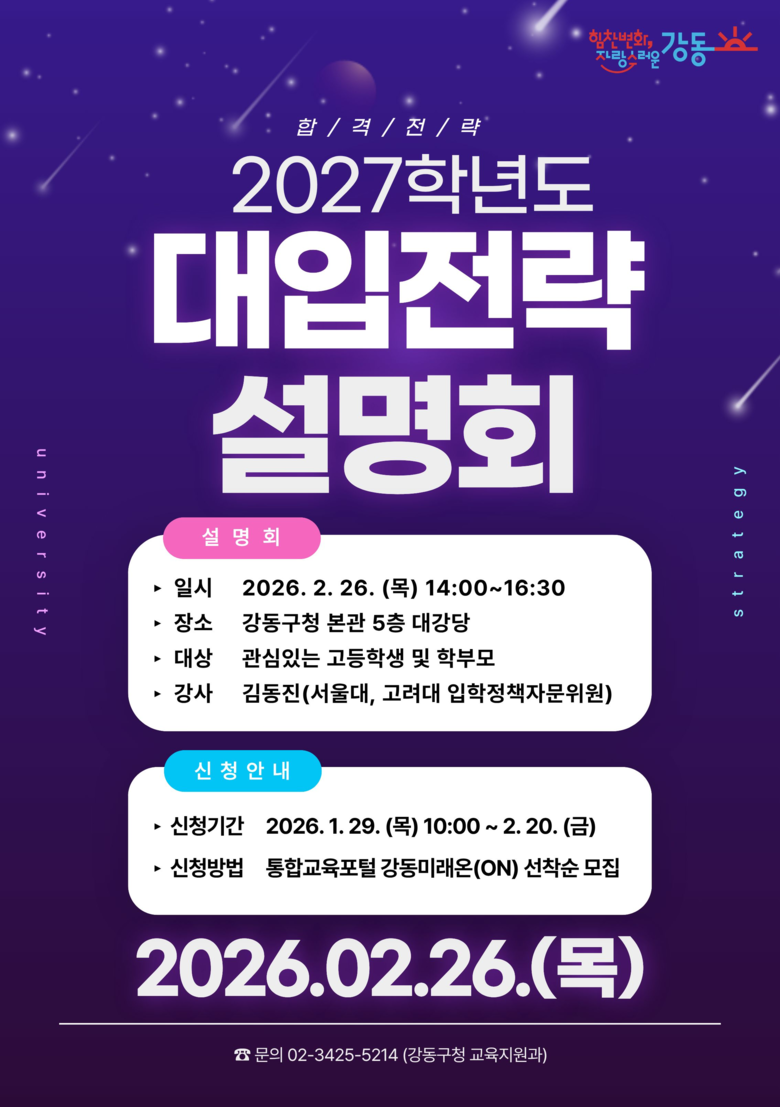 - 1월 29일(목) 10시부터 ‘강동미래온(ON)’에서 신청 가능 [강동구 세계타임즈=이장성 기자] 서울 강동구(구청장 이수희)가 2027학년도 대학입학전형에 대비한 올해 첫 대입전략설명회를 오는 2월 26일(목) 강동구청 5층 대강당에서 개최한다고 28일 밝혔다.