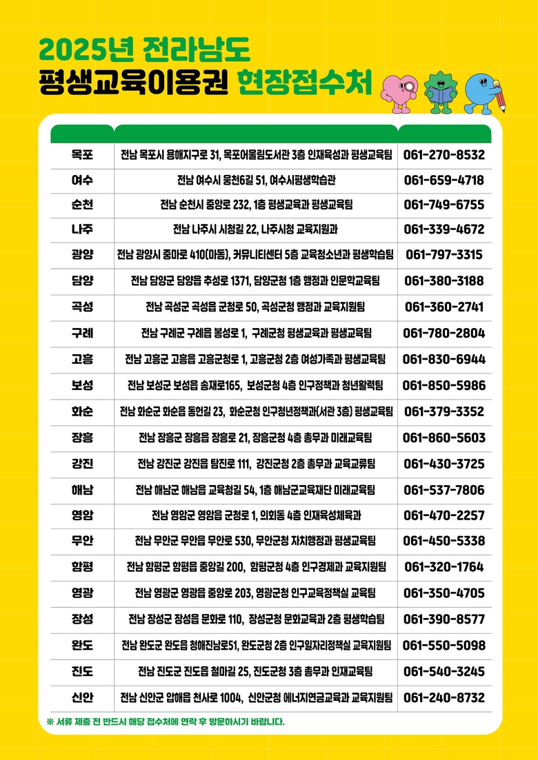 선정자 발표는 오는 7월 21일 예정이다. 이용권 신청과 사용 방법 등 자세한 내용은 전남인재평생교육진흥원 평생교육팀(061-285-9473~4)에 문의하거나 전남도 평생교육이용권 누리집 공고 등을 통해 확인할 수 있다.
