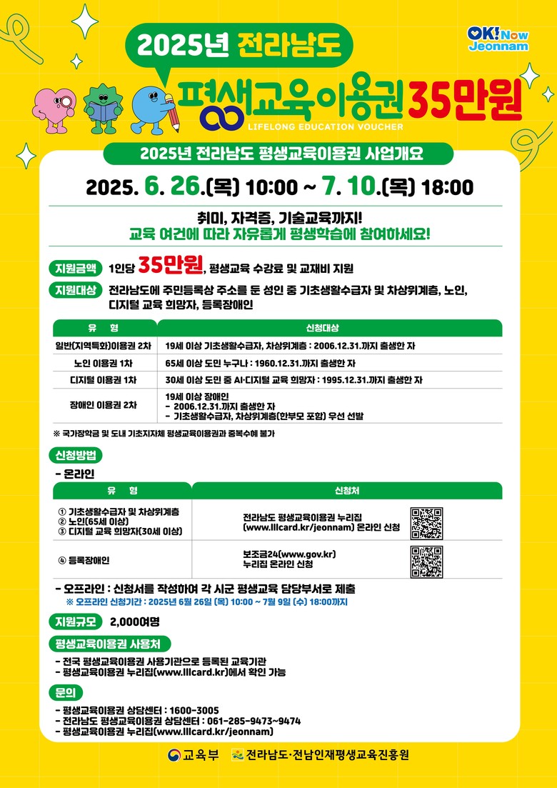 - 1인 35만 원…국가장학금·시군 수혜자 중복지원은 불가 - [전남 세계타임즈=우덕현 기자] 전라남도와 전남인재평생교육진흥원은 26일부터 7월 10일까지 저소득층, 인공지능(AI)·디지털 교육 희망자, 노인, 장애인 등 성인을 대상으로 2025년 전남도 평생교육이용권 대상자 2천여 명을 추가 모집한다고 밝혔다.