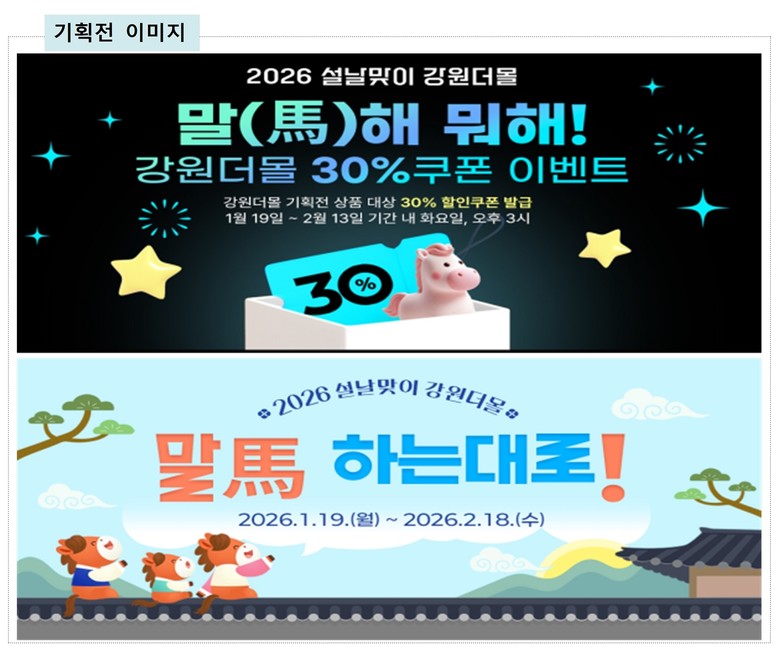 행사 기간 동안 강원더몰에서는 설 특판 상품을 한데 모은 기획전 전용관을 운영하고, 소비자의 구매 부담을 낮추기 위한 다양한 할인 및 참여형 이벤트를 마련했다.