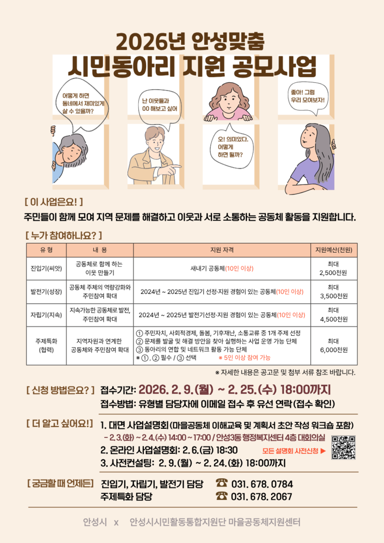 이번 공모는 ▶「2026년 동네 어르신과 함께하는 안성맞춤 마을공동체 지원」과 ▶「2026년 안성맞춤 시민동아리 지원」 등 2개 분야로 진행된다.