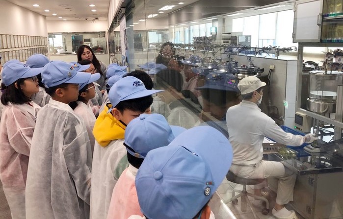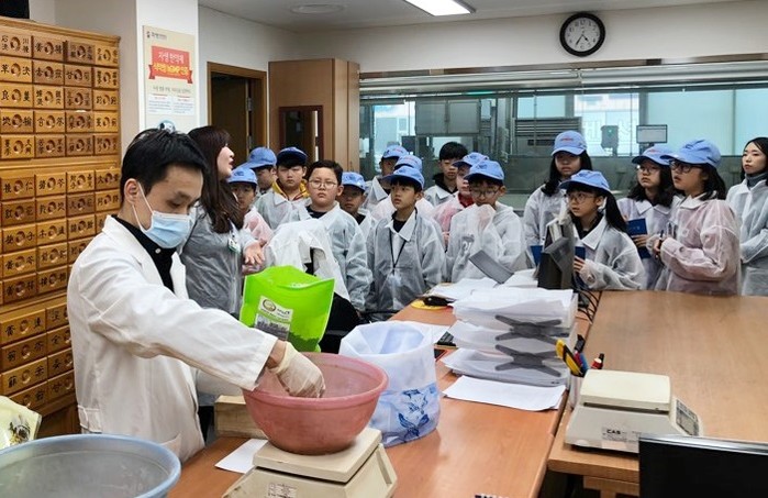 | ▲부산글로벌빌리지 주니어기자단 학생들이 자생한방병원 해운대 원외탕전원을 방문해 한약 조제과정을 견학하고 있다. |