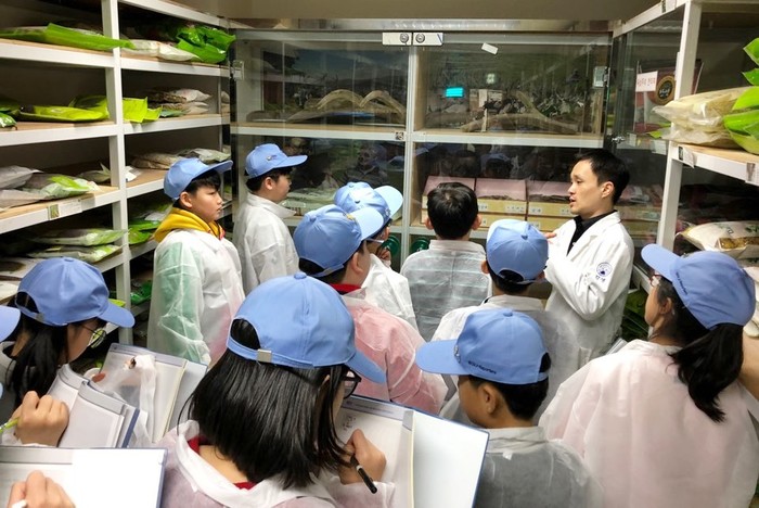| ▲부산글로벌빌리지 주니어기자단 학생들이 자생한방병원 해운대 원외탕전원 한약 조제과정에 대한 설명을 듣고 있다. |