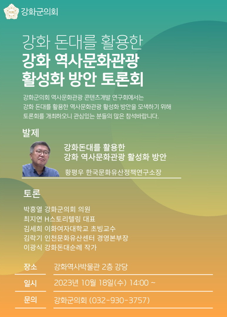 토론회는 오현식 강화군의회 의원의 개회사를 시작으로 황평우 한국문화유산정책연구소장이 ‘강화 돈대를 활용한 강화 역사문화관광 활성화 방안’을 주제로 발제한다. 박흥열 강화군의회 의원이 좌장을 맡으며 최지연 H스토리텔링 대표, 김세희 이화여대 초빙교수, 김락기 인천문화유산센터 경영본부장, 이광식 강화돈대순례 작가가 토론자로 참석한다.