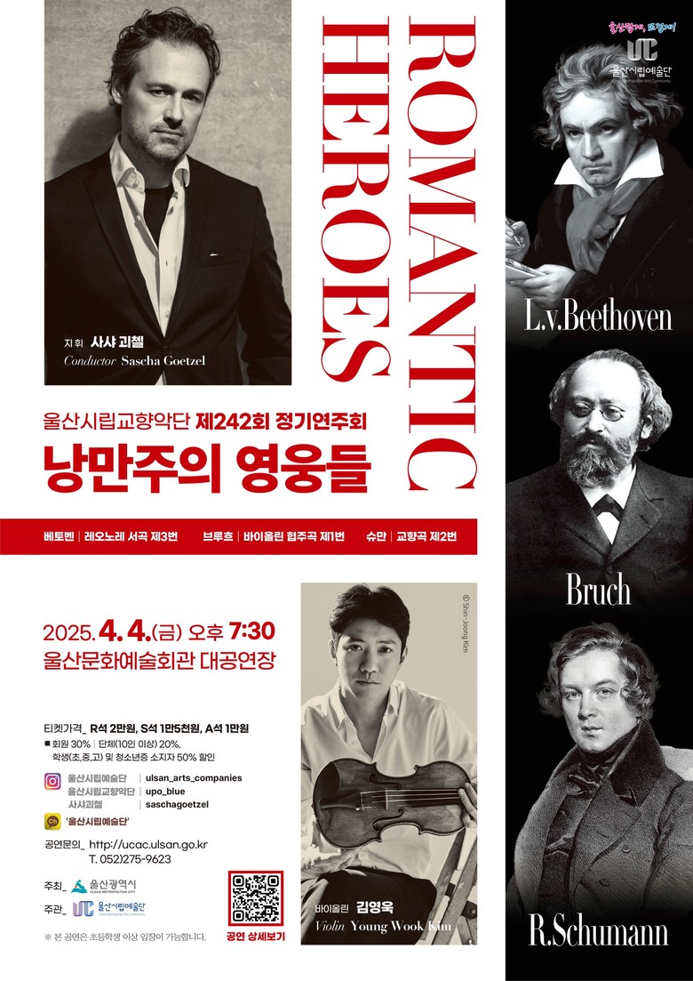 시립교향악단 사샤 괴첼 예술감독이 직접 지휘봉을 잡고, 바이올리니스트 김영욱이 협연하는 이번 무대는 브루흐 바이올린협주곡 제1번, 슈만 교향곡 제2번 등 낭만주의 명곡을 선사한다.