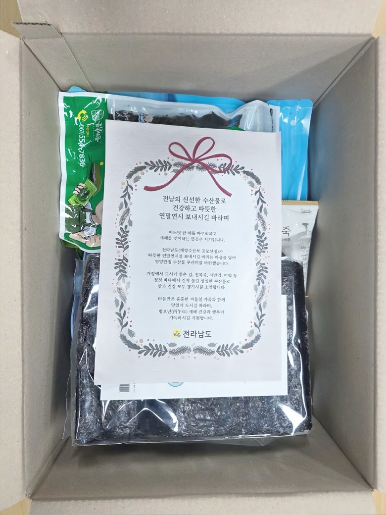 수산물 꾸러미는 전남에서 생산한 수산물 중 곱창김, 전복죽, 다시마, 미역 등 7종 4만 원 상당으로 양질의 영양식이면서도 조리하기 간편한 수산가공품으로 이뤄졌다.