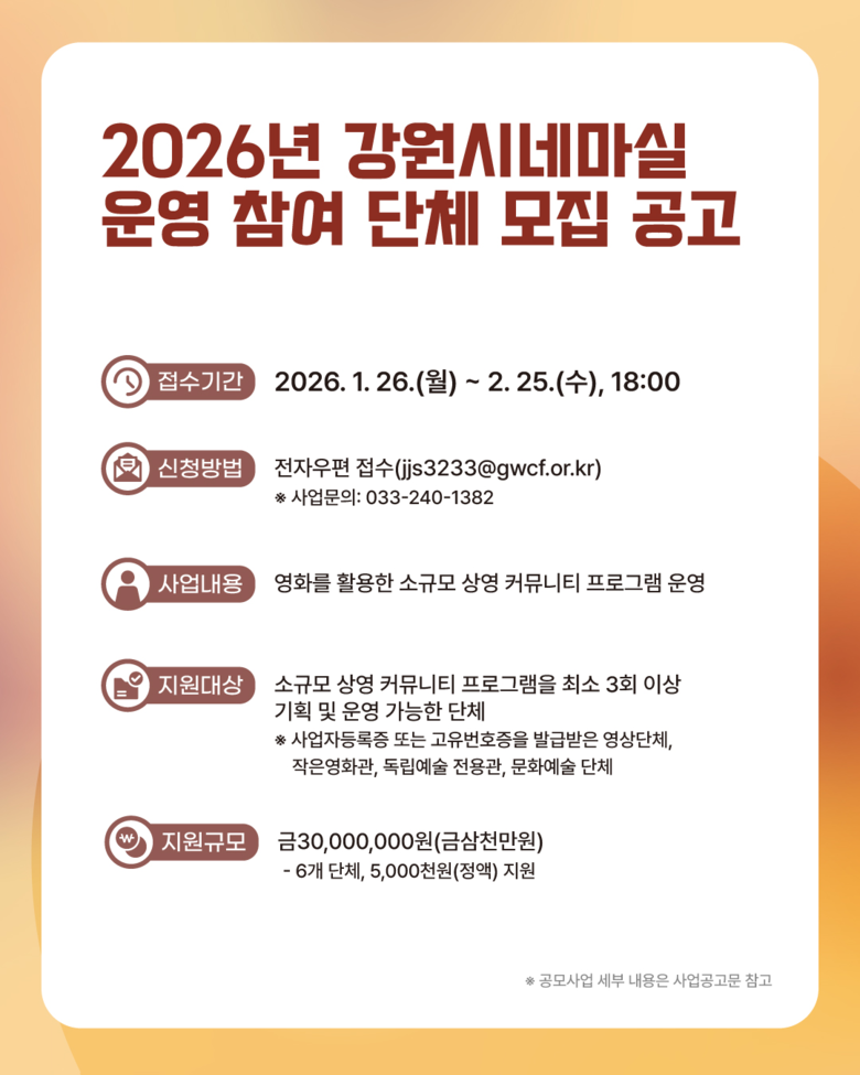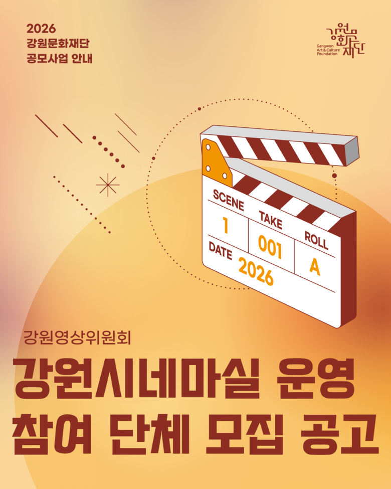 신현상 강원문화재단 대표이사는 “강원시네마실은 지역 곳곳에서 자발적인 영화 상영과 커뮤니티 형성을 지원하는 사업”이라며, “도민이 일상 가까이에서 영화를 즐길 수 있는 상영 문화 확산의 계기가 되길 기대한다”고 말했다.