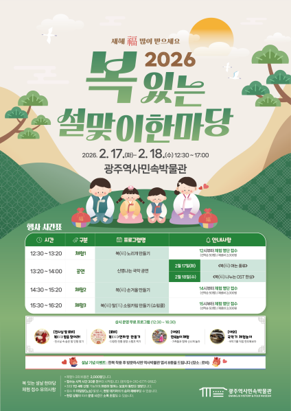 [광주 세계타임즈=손권일 기자] 광주광역시 역사민속박물관은 민족 최대 명절 설날을 맞아 ‘2026 설맞이 한마당’을 역사민속박물관 일원과 마한유적체험관에서 각각 운영한다.