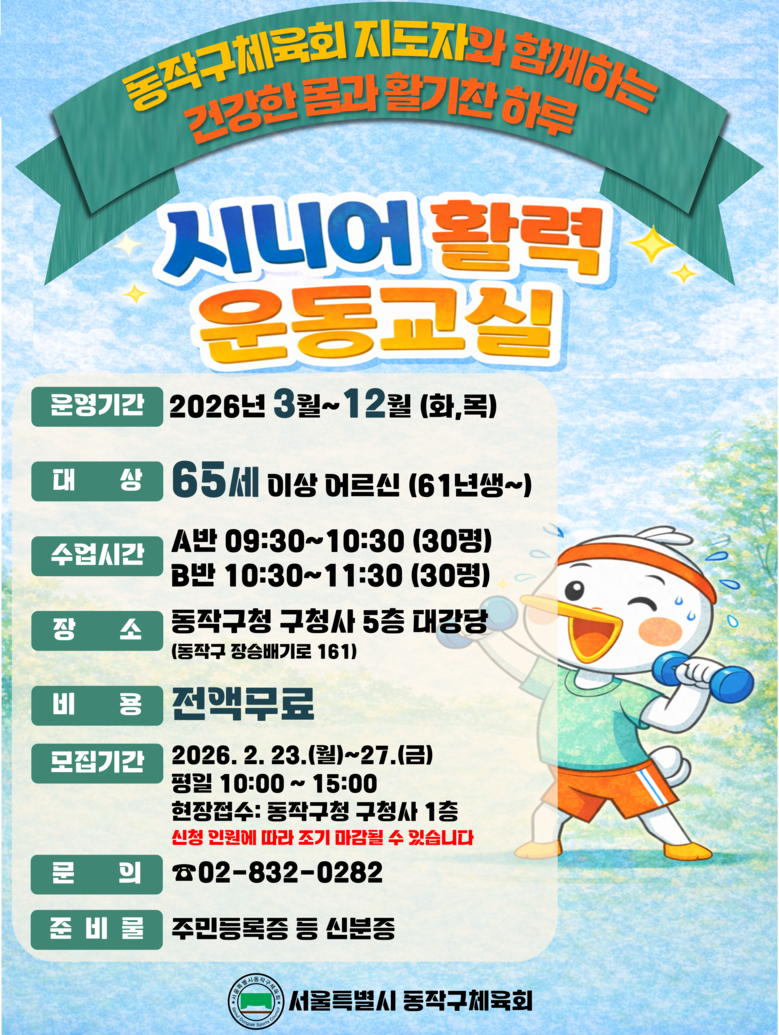 수강료는 무료이며, 기타 자세한 사항은 동작구 체육회(☎02-832-0282)로 문의하면 된다.