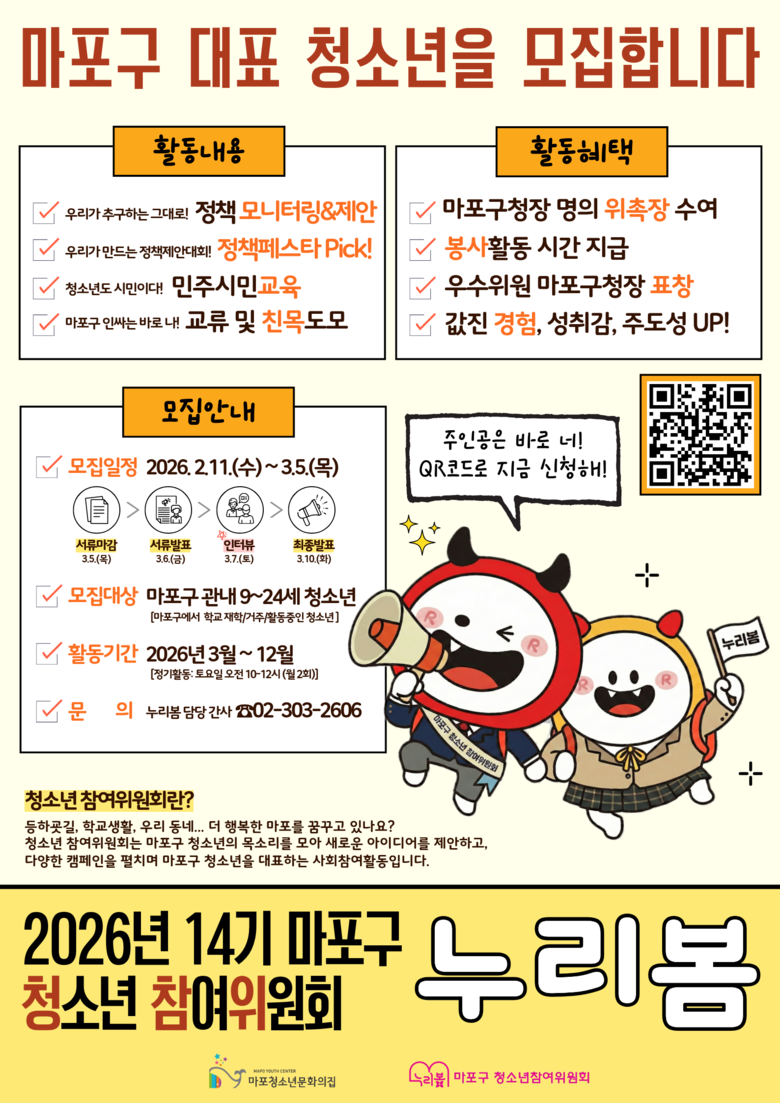 이번에 모집하는 제14기 위원은 마포구에 거주하거나 지역 내 학교에 재학 중인 9세부터 24세 청소년 20명으로, 공개모집과 기관 추천을 병행해 선발한다.
