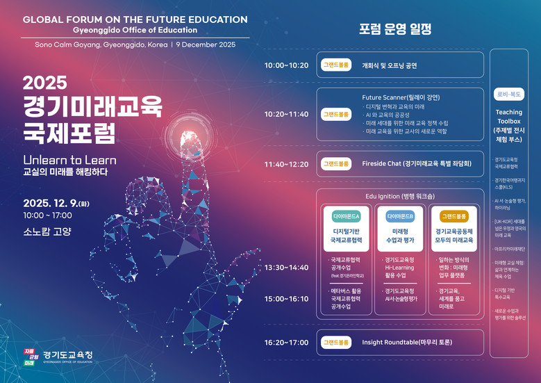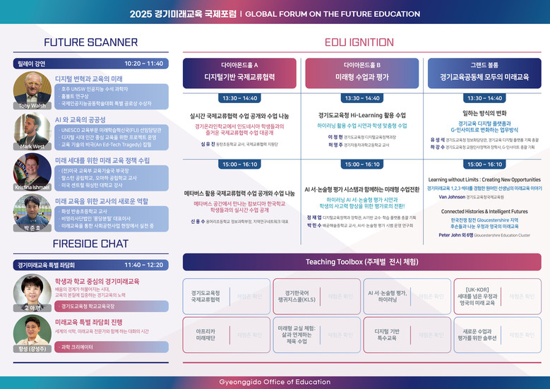 도교육청 관계자는 “글로벌 석학의 거시적 통찰부터 현장 교사의 생생한 경험까지, 다양한 관점에서 미래교육을 조망할 수 있는 매우 특별한 자리가 될 것”이라며 “이론과 정책, 실천이 만나는 자리에서 경기미래교육의 새로운 방향을 모색하는 기회로 삼겠다”고 말했다.