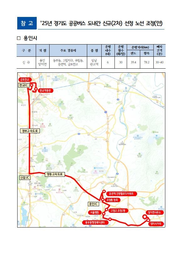 이번 2025년도 광역 공공버스 도내간 신규노선 신설은 출퇴근 시간대 광역 이동 기능 강화에 초점을 맞추어 추진되었다. 특히, 양지면-판교역 노선의 경우 도내 주요 생활권과 고용거점을 보다 촘촘히 연결하고 통행시간 단축과 정시성 개선을 통해 도민의 체감 이동 편의를 높이기 위해 운행경로를 조정하고 운행거리·운행대수 등 운영계획의 합리화를 병행하는 방향으로 추진되었다. 이에 따라 용인IC 경유로 진출입 체계를 정비해 양지-판교 간 운행시간을 단축하고 출퇴근 광역버스 기능을 실질적으로 강화하는 데 방점을 두었다.