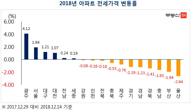 광주가 4.12%로 전국에서 전셋값이 가장 많이 올랐다. 서구와 동구 등 구도심 지역 재개발 재건축 이주수요와 학군수요가 몰리면서 전셋값 상승폭이 컸다. 서울은 아파트 전셋값이 1.94% 올랐지만 2008년 이후 최저치를 기록했다. 직주접근이 좋은 중구와 종로가 소폭 상승했고 매년 전셋값 상승률이 높았던 강남3구는 안정적인 모습을 보였다. 서울시에서 강남권 재건축 아파트 이주시기를 조정하면서 전세수요가 분산됐기 때문이다. 이어서 대구(1.21%), 대전(1.07%), 전남(0.24%) 순으로 전셋값이 올랐다. 대구와 대전은 학군이 좋은 지역으로 전세수요가 몰리면서 전셋값이 강세였다.
