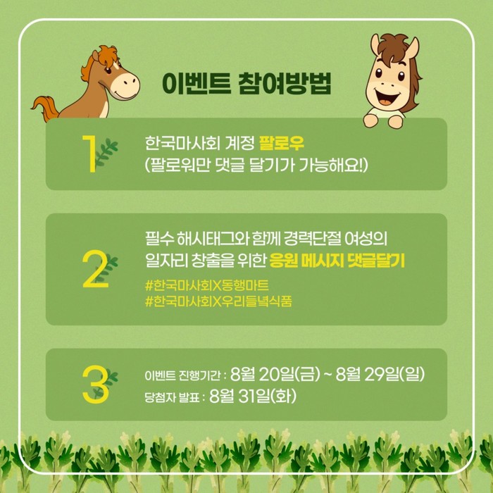 한국마사회는 캠페인 기간(8.20~8.29) 동안 기관 SNS를 통해 ‘우리들녘식품’의 홍보와 함께 ‘비건 나물 비빔밥 궁극의 양념장 만들기’ 콘텐츠를 공개할 예정이다. 또한 댓글이벤트를 통해 ‘경력단절 여성의 일자리 창출 응원 메시지’를 올려준 참여자 90명에게는 나물비빔밥 월컴키트, 할인쿠폰을 증정하는 행사도 함께 진행될 예정이다.