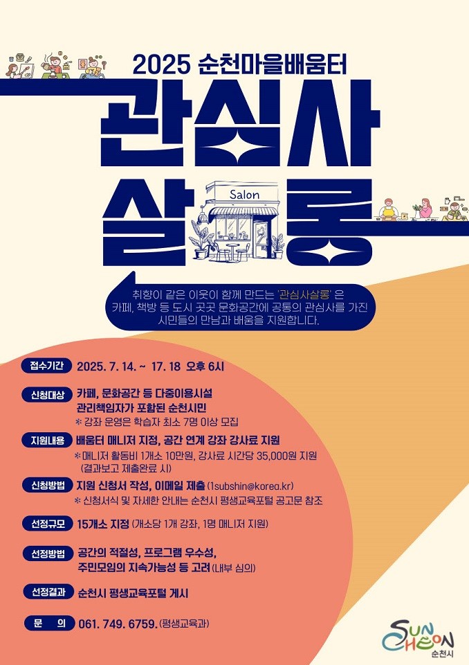 신청 기간은 오는 14일부터 18일까지이며, 순천시 평생교육포털(https://lms.schc.go.kr) 내 공지사항에서 자세한 내용을 확인할 수 있다. 시는 심사를 거쳐 총 15개소 내외를 선정해 지원할 계획이다.