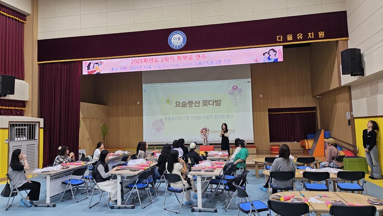 [파주시 세계타임즈=송민수 기자] 다율유치원(원장 박경숙)은 지난 10월 15일(수), 학부모회 주관으로 유치원 3층 강당에서 학부모들을 대상으로 하는 연수를 실시하였다.