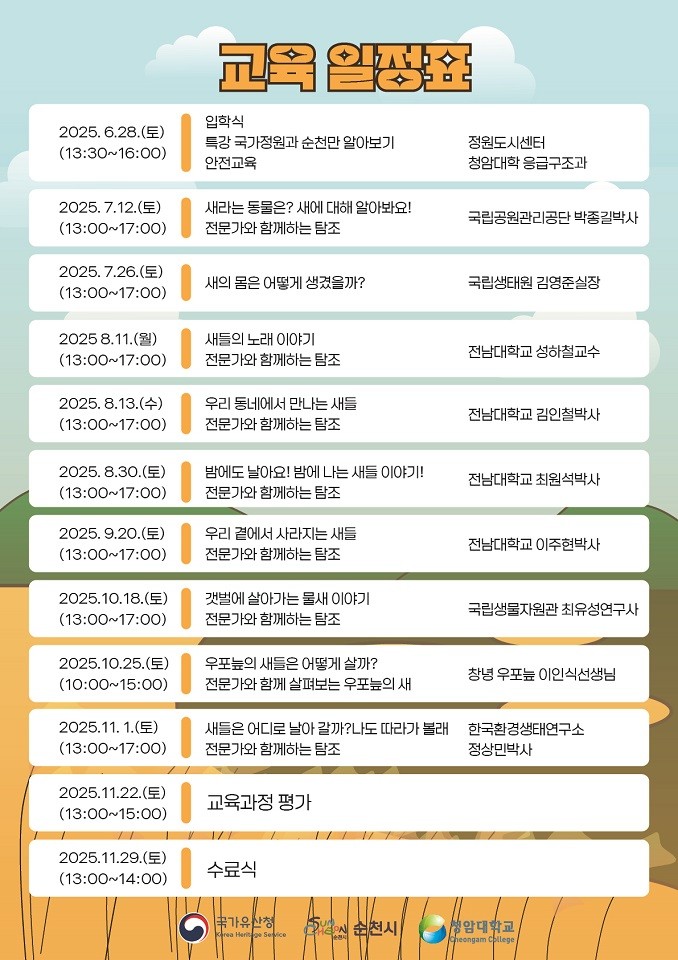 교육은 6월 28일부터 11월 29일까지 매월 정해진 요일, 총 12주 42시간 동안 진행되며, 순천시 어울림도서관과 순천만자연생태관에서 이론 강의와 야외 탐조활동을 병행한다. 주요 내용으로는 △새의 분류와 생태 △울음소리와 이동 경로 △우포늪 생태 탐방 △멸종위기종 이해 △나만의 탐조 노트 만들기 등 아이들이 새를 통해 자연을 바라보고, 마음의 평온을 되찾는 생태 치유형 교육 콘텐츠로 구성되며, 조류·생태 분야 전문가들이 강사로 참여해 전문성과 몰입도를 높일 예정이다.