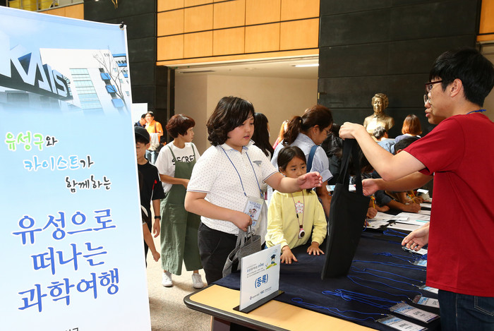 <사진 : 23일, 24일 유성구 꿈나무과학멘토 일환으로 KAIST에서 열린 유성구와 KAIST가 함께하는 ‘유성으로 떠나는 과학여행’이 전국에서 모인 200여명의 초등학생과 학부모가 참여한 가운데 성황리에 마무리됐다. 사진은 참가학생들이 등록신청을 하고 있는 모습>
