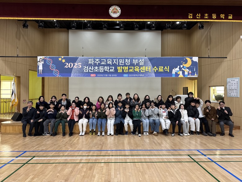 [파주시 세계타임즈=송민수 기자] 경기도파주교육지원청(교육장 전선아)은 12월 5일(금), 2025 파주교육지원청 부설 검산초등학교 발명교육센터 수료식을 개최했다고 밝혔다.