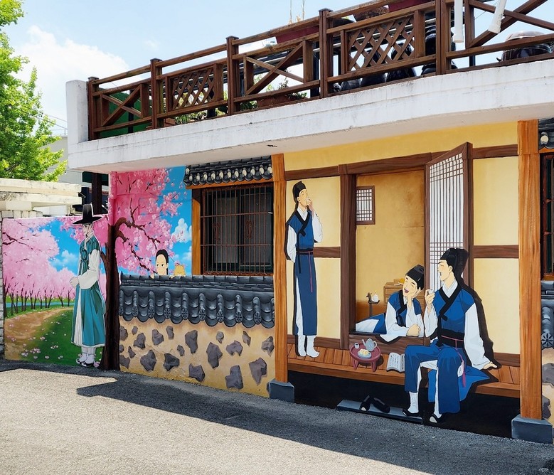 서문성터길 벽화의 첫부분을 사랑스러운 낭자와 유생 모습의 입체 사인물로 구성하고 익살스러운 선비들의 모습을 시각적으로 그려놓아 다채롭고 동적인 포토존을 조성했다.