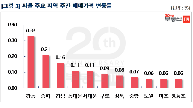 부동산114(www.r114.com)에 따르면 금주 서울 아파트값은 0.09% 올라 지난 주(0.08%) 대비 상승폭이 커졌다. 재건축이 0.14%, 일반아파트가 0.09%의 변동률을 기록했다. 입주 10년 이내의 재고아파트 주요 단지들을 중심으로 매물 부족 현상이 나타났고, 상대적으로 저평가된 재건축 단지들도 상승세를 이끌었다. 신도시와 경기ㆍ인천의 매매가격은 별다른 움직임 없이 보합(0.00%)을 기록했다.