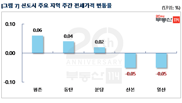 신도시는 △평촌(0.06%) △동탄(0.04%) △분당(0.02%) 등은 상승한 반면 ▼일산(-0.05%) ▼산본(-0.05%)은 하락했다. 평촌은 호계동 목련신동아와 무궁화태영이 500만원 올랐다. 동탄은 청계동 동탄역더샵센트럴시티와 영천동 동탄반도유보라아이비파크2차가 500만원-1,500만원 상승했다. 반면 일산은 주엽동 문촌17단지신안과 마두동 강촌2단지한신이 500만원-1,000만원 떨어졌다.