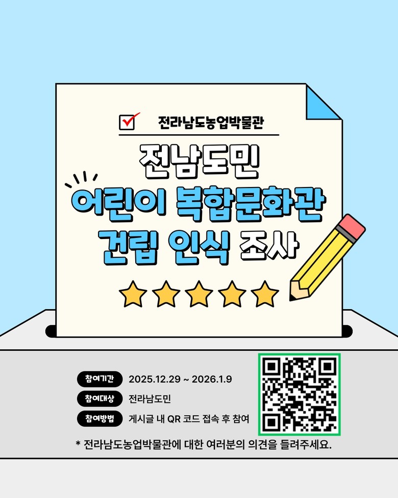 김옥경 전남농업박물관장은 “설문을 통해 수렴된 의견을 관람객 중심의 박물관 운영과 전남도만의 농업 특색을 살린 어린이 복합문화공간 조성에 적극 접목하겠다”고 밝혔다.