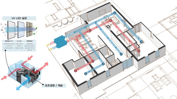 대림산업은 업계 최초로 안티 바이러스 환기시스템을 개발해 특허를 출원했다고 10일 밝혔다. 대림이 개발한 이 시스템은 공기청정형 환기시스템에 자외선 발광다이오드(UV LED) 광촉매 모듈을 탑재해 바이러스를 제거하게 된다. UV LED는 인체와 환경에 미치는 부작용은 적은 대신 살균 효과는 우수하다. 실제로 대림의 안티 바이러스 환기시스템은 한국산업기술시험원(KTL)의 시험결과 부유바이러스 저감률 99.9%, 부유세균 저감률 99.5%, 오존 발생농도 0.009ppm 등의 성능을 확보한 것으로 평가 받았다.