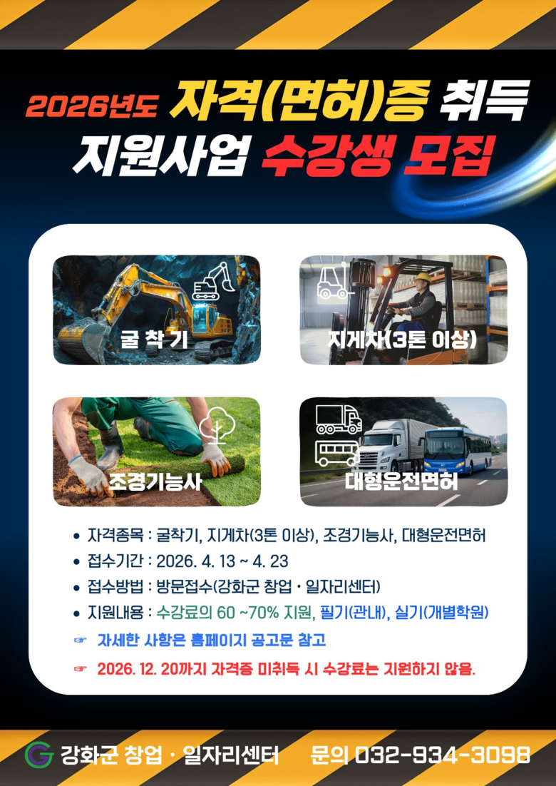 자격(면허)증 취득 지원사업과 관련한 더 자세한 사항은 강화군 창업·일자리센터(☎ 032-934-3098)로 문의하거나 홈페이지 공고문을 참고하면 된다.