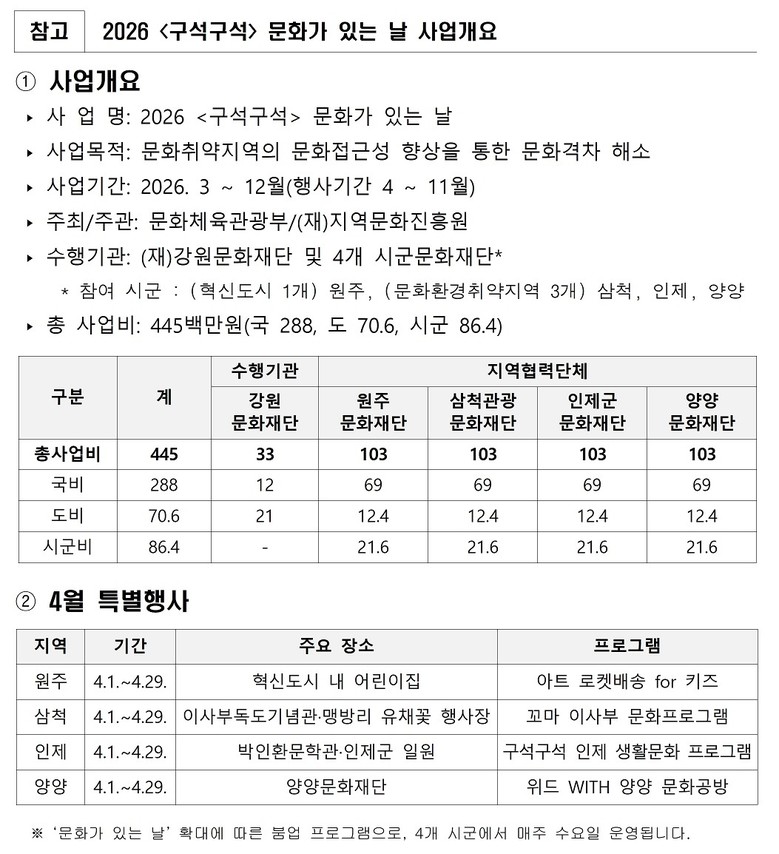 [강원도 세계타임즈=김민석 기자] 강원문화재단(대표이사 신현상)은 문화체육관광부와 강원특별자치도가 주최하고 지역문화진흥원이 주관하는 ‘2026 <구석구석> 문화가 있는 날’ 사업을 4월부터 본격 추진한다고 밝혔다.