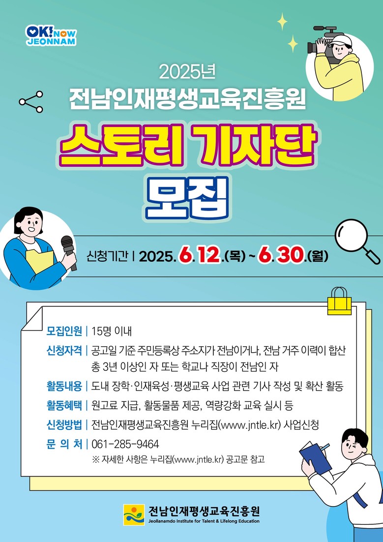 스토리기자단은 전남인재평생교육진흥원의 주요 활동과 도내 장학·인재육성·평생교육 관련 소식을 쉽고 재미있게 전달하기 위해 기사, 만화, 카드뉴스 등 다양한 형식의 콘텐츠를 제작하는 역할을 맡는다.