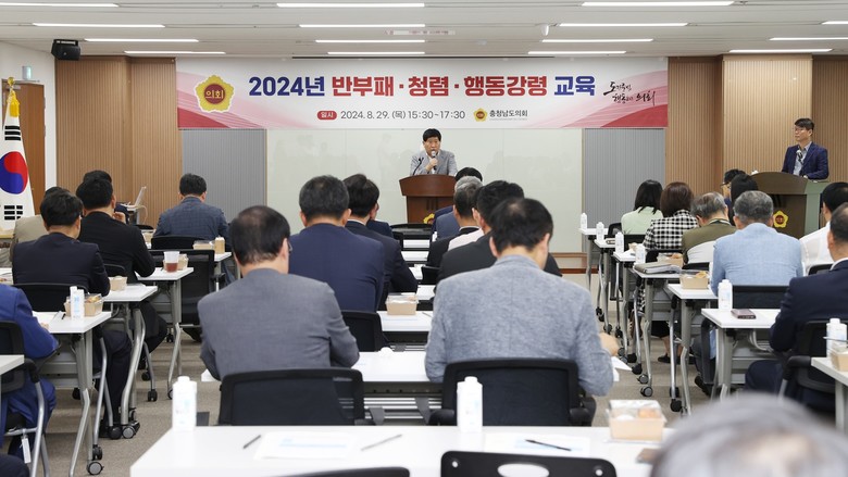 [충남 세계타임즈=백택기 기자] 충남도의회(의장 홍성현)는 29일 의회 회의실에서 도의원과 사무처 고위공직자는 물론 전직원이 참여한 가운데 청탁금지법 준수 등 반부패·청렴 실천, 지방의원 행동강령을 주제로 한 ‘청렴 교육’을 진행했다.