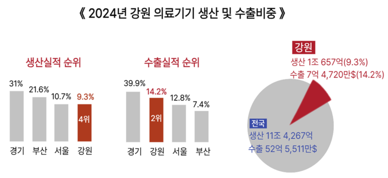 - 수출액뿐만 아니라 강원 의료기기 생산액은 같은 기간 6,423억 원에서 1조 657억 원으로 증가하며 연평균 13.5%의 높은 성장률을 기록했고, 전국 생산 비중도 9.3%로 확대됐다.