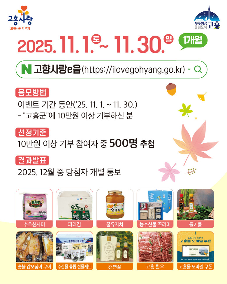 이번 이벤트는 연말정산 시즌을 앞두고 기부자들의 관심이 높아지는 시기에 맞춰 마련된 것으로, 기간 내 고흥군에 10만 원 이상 기부한 참여자 중 500명을 무작위로 추첨해 다이소 모바일 상품권(1만 원권)을 증정한다.