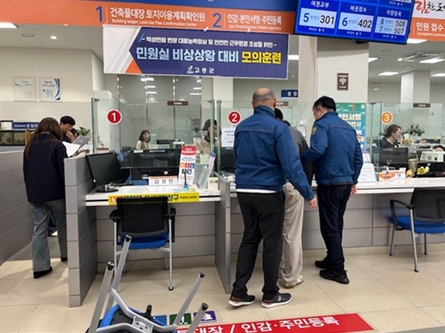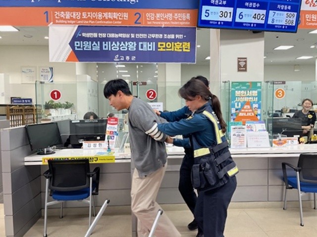 [고흥군 세계타임즈=우덕현 기자] 고흥군(군수 공영민)은 지난 5일 군청 종합민원실에서 악성 민원 발생 시 비상상황에 대비해 체계적인 현장 대응능력 향상을 위해 고흥경찰서의 협조로 모의훈련을 실시했다.