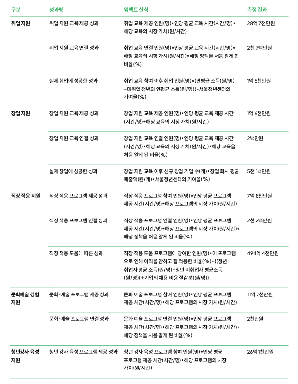 이번 측정은 임팩트 평가 전문 연구기관(임팩트리서치랩)이 '24년 1월~'25년 9월 서울청년센터 사업 결과를 바탕으로 센터 담당자 심층 인터뷰, 센터 이용 경험이 있는 청년 1,404명을 대상으로 한 인터뷰.설문조사 등을 면밀히 분석한 결과다.