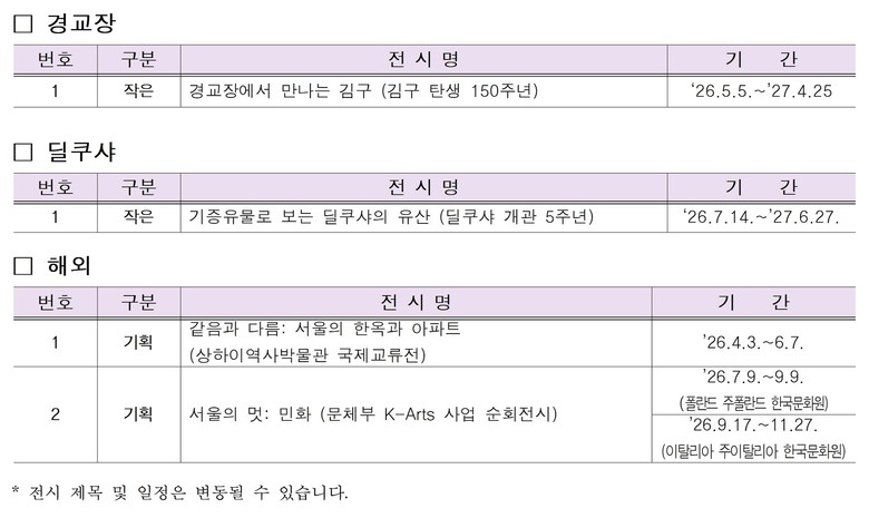 - 해외 순회전인 투어링 K-아츠 『서울의 멋: 민화』(7월~9월 바르샤바/9월~11월 로마)와 상하이역사박물관 교류전 『같음과 다름: 서울의 한옥과 아파트』(4월~6월 상하이)를 통해, 서울 일상에 깃든 K-컬처의 정수를 세계에 알린다. 조선시대 팝아트로 불리는 민화의 파격적 미감은 물론, 한국 고유의 ‘온돌’과 ‘안방’ 문화를 현대 아파트에 이식해 온 서울의 주거문화를 각각 조명한다.