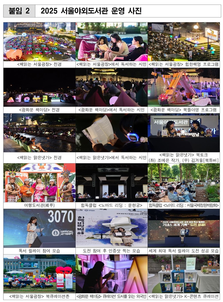 한편, 지난 9월에는 총 3,532명의 시민이 참여한 가운데 ‘세계 최대 독서 릴레이’에 도전해 세계 기네스 기록을 달성하며 ‘서울야외도서관’의 공공성과 대한민국 독서 문화의 위상을 국내외에 알리는 성과를 거뒀다.