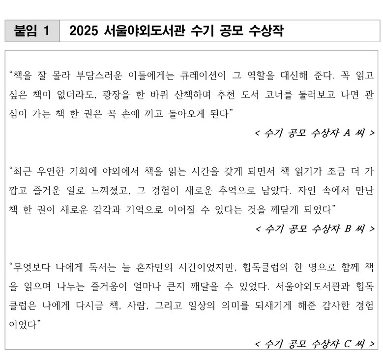 이러한 콘텐츠 강화의 결과, 방문객 약 5천 명을 대상으로 한 설문조사에서 10명 중 8명이 현장에서 1권 이상 책을 읽었다고 응답했다. 이를 통해 ‘서울야외도서관’이 단순히 머무르는 공간을 넘어, 시민이 스스로 책을 읽고 다양한 방식으로 ‘독서의 즐거움’을 경험하는 공간으로 도약했음을 확인할 수 있었다.