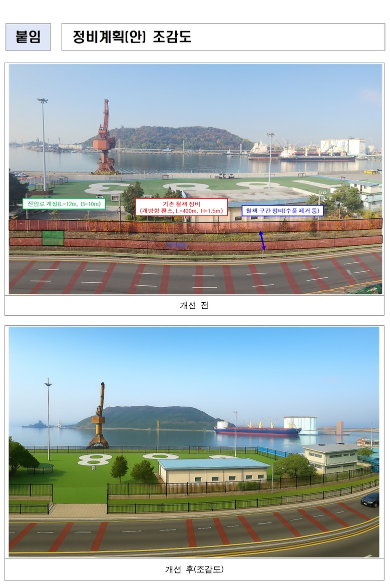 * 개항광장 진입로 개설(L=12m, B=10m), 기존 철책 정비(개방형 휀스, L=400m, H=1.5m)