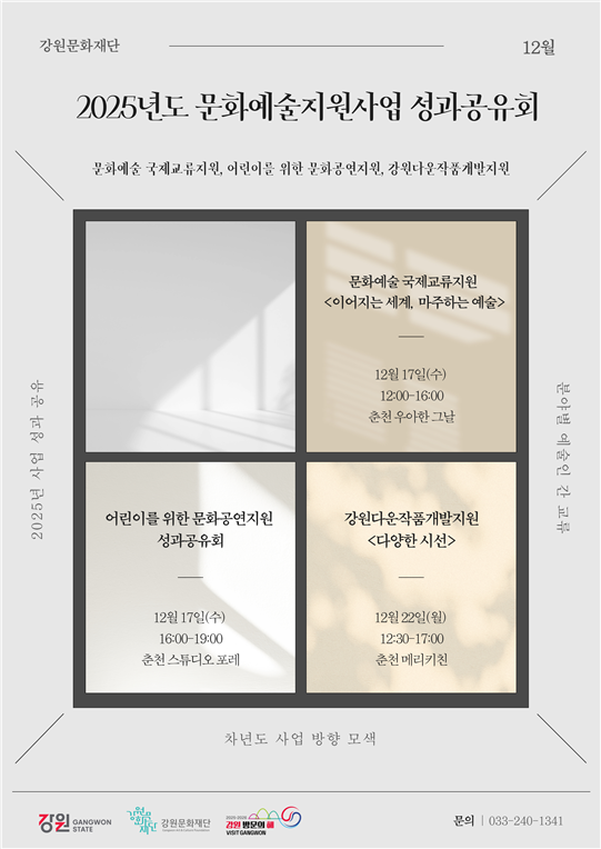 ・예술 현장의 의견을 수렴하여 지원 체계 개선의 토대 마련 [강원도 세계타임즈=김민석 기자] 강원문화재단(대표이사 신현상)은 2025년도 주요 예술지원사업에 참여한 예술인·예술단체와 함께 올 한 해의 성과를 나누고 2026년 사업 방향을 모색하기 위한 세 개의 성과공유회를 12월 중 순차적으로 개최한다.