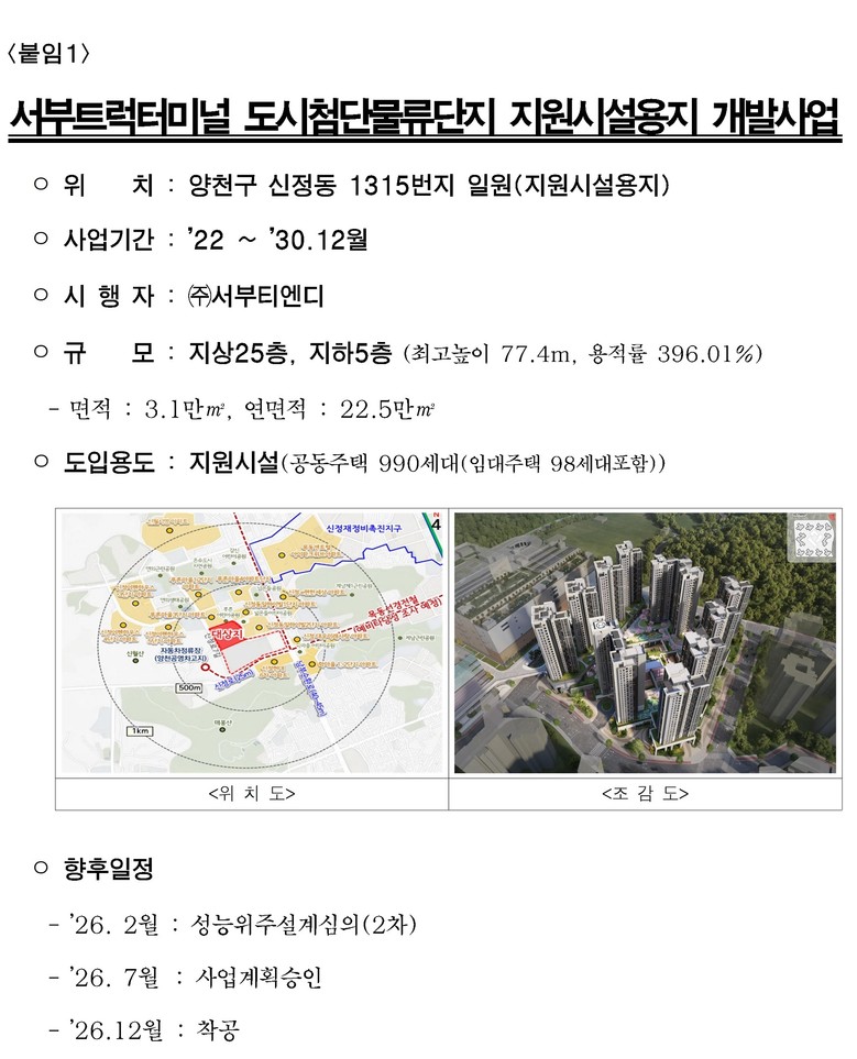 ① 서부트럭터미널: 25층 공동주택 990세대·업무시설 1.6만㎡ 공급…서남권 랜드마크 조성