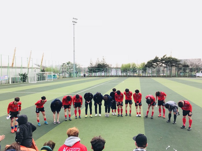 | ▲ 경기 종료 후 응원단과 지인 분들에게 감사의 인사를 전하고 있는 신경대학교 축구부 |