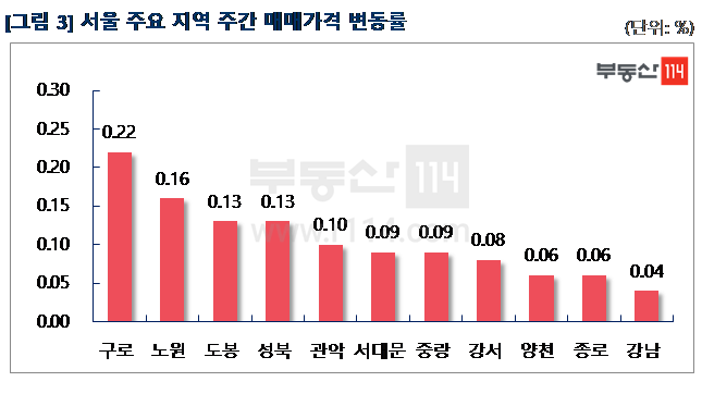 부동산114(www.r114.com)에 따르면 금주 서울 아파트값 변동률은 전주(0.06%) 대비 소폭 둔화된 0.05%를 기록했다. 재건축이 보합을 나타내며 가격 움직임이 제한된 반면, 일반 아파트는 0.06% 상승했다. 신도시는 0.01%, 경기ㆍ인천은 0.01% 올랐다.