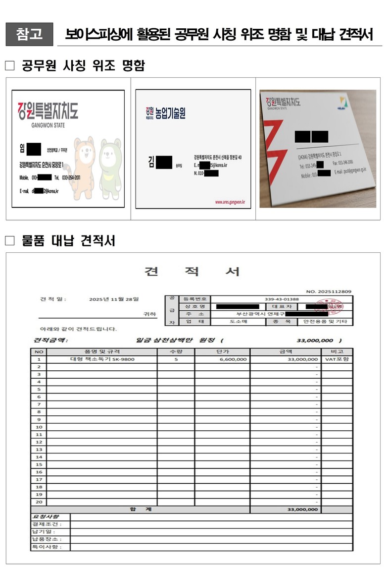 – 가짜 명함·물품 대납 요구 등 사기 시도 사례 잇따라 발생 – [강원도 세계타임즈=김민석 기자] 강원특별자치도는 최근 도청 공무원을 사칭하여 민간 업체에 금품을 요구하는 보이스피싱 시도가 연이어 발생함에 따라, 도민 및 지역 기업을 대상으로 각별한 주의를 당부했다.
