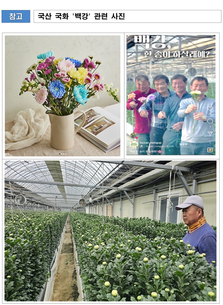 유미복 시 농업기술센터 소장은 “국산 국화 백강이라는 품종만의 성과가 아니라 현장에서 함께 도전해 준 민관합동 추진협의회 및 화훼농가와의 공동성과다”라며, “앞으로도 수입 품종에 의존하던 작목들을 국산 품종으로 단계적으로 전환할 수 있도록 현장 실증과 기술 보급, 판로 연계를 묶은 부산형 보급모델을 지속해서 만들어 가겠다”라고 전했다.
