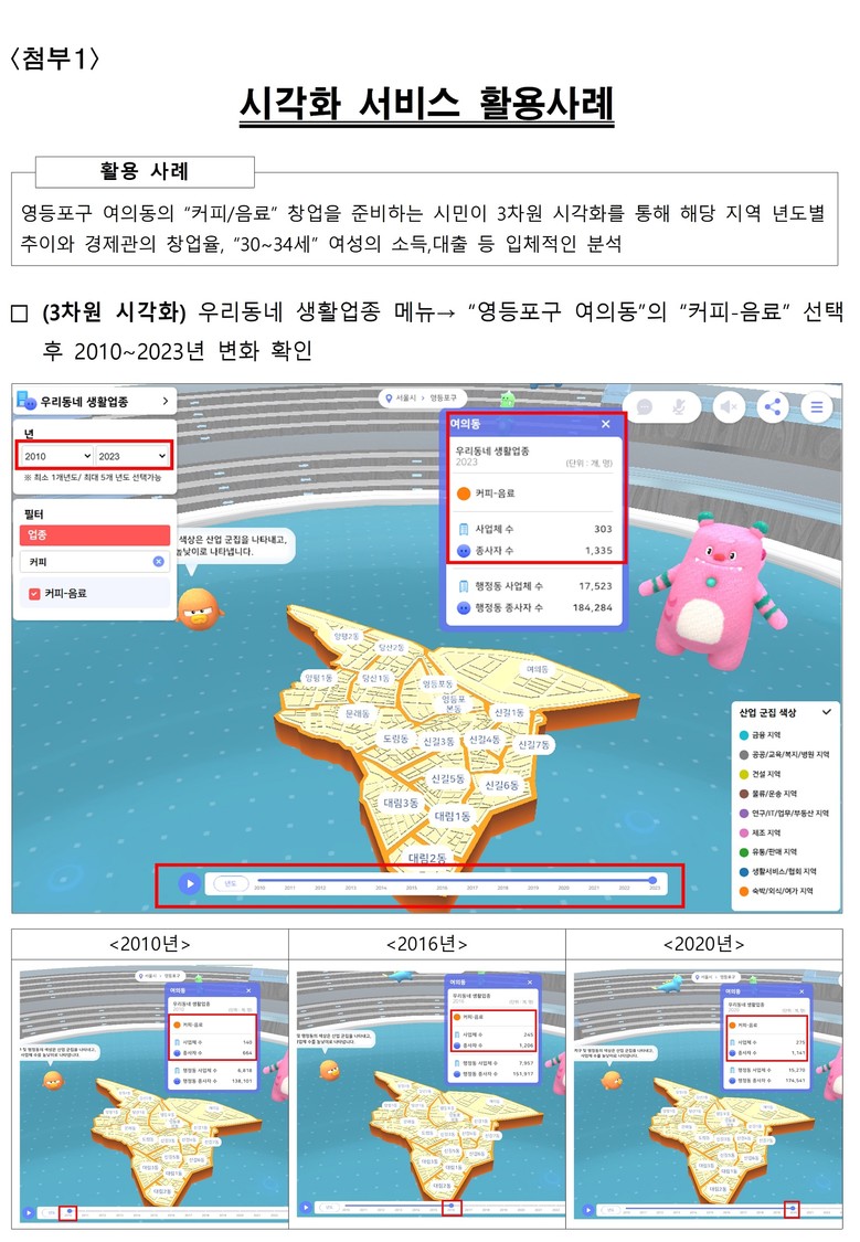 이번 서비스의 핵심 기능 중 하나는 2010~2023년 사업체 조사 데이터를 활용해 서울 전역 산업구조 변화와 흐름을 입체적으로 볼 수 있도록 ‘행정동 단위 산업.상권 변화’를 3차원 시각화한 기능이다. 특정 자치구나 행정동을 선택해 2010년 이후 어떤 산업이 성장하거나 쇠퇴했는지를 시간 흐름에 따라 확인할 수 있다.